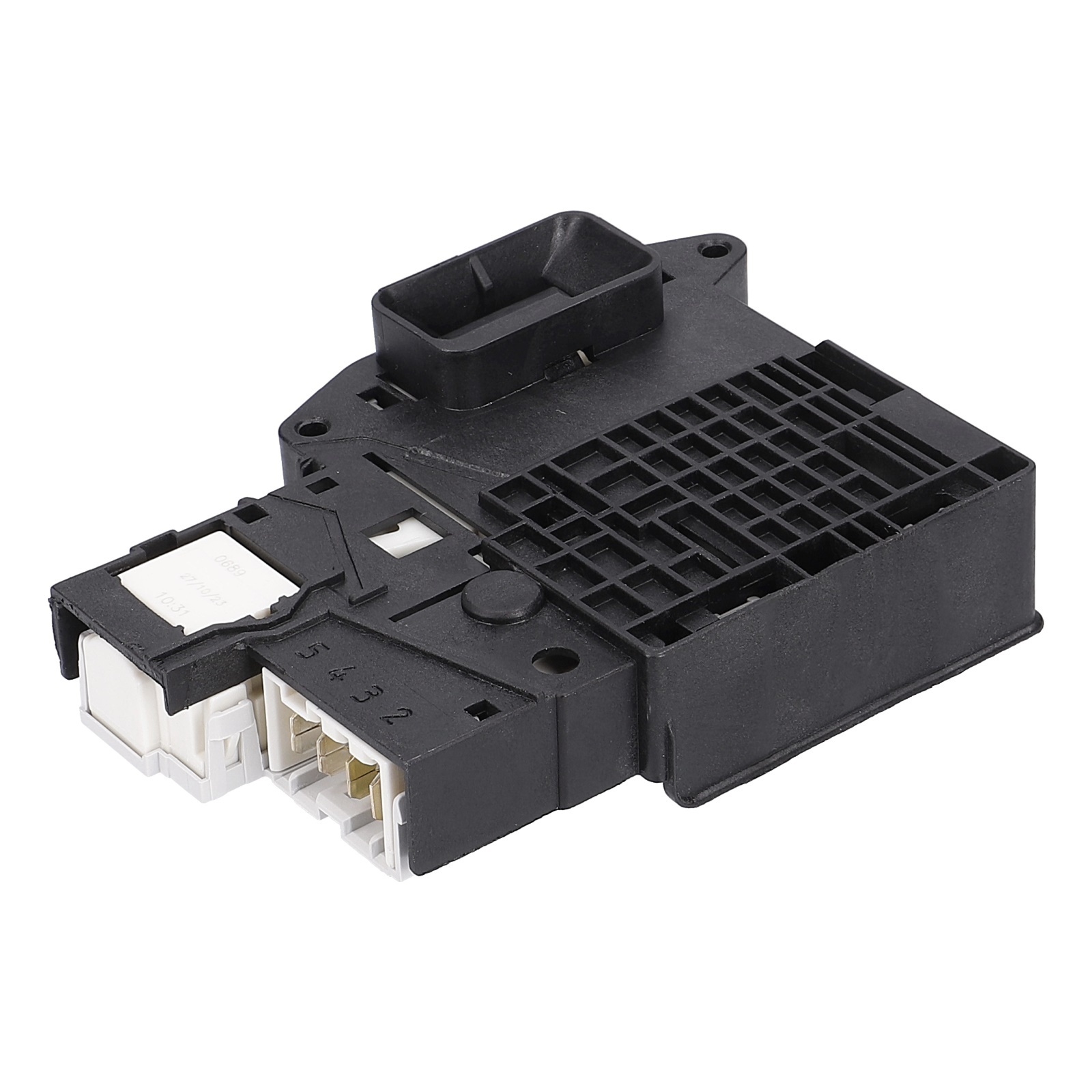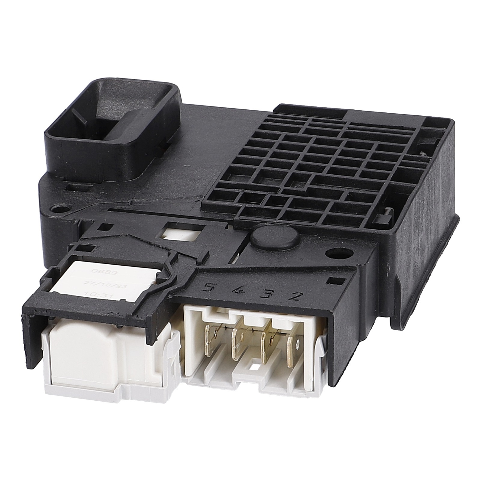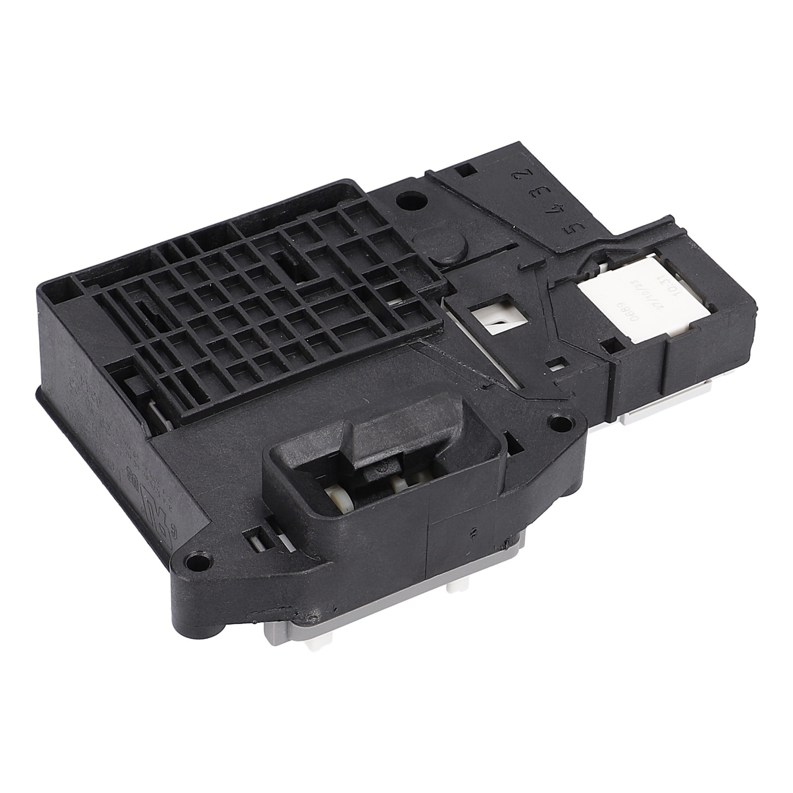 Das schwarze Verzögerungsrelais mit 4 Steckanschlüssen ist in der Einfüllöffnung vom Waschtrockner bzw. der Frontlader-Waschmaschine eingebaut. Die Verriegelung dient als Türöffnungsverzögerer.