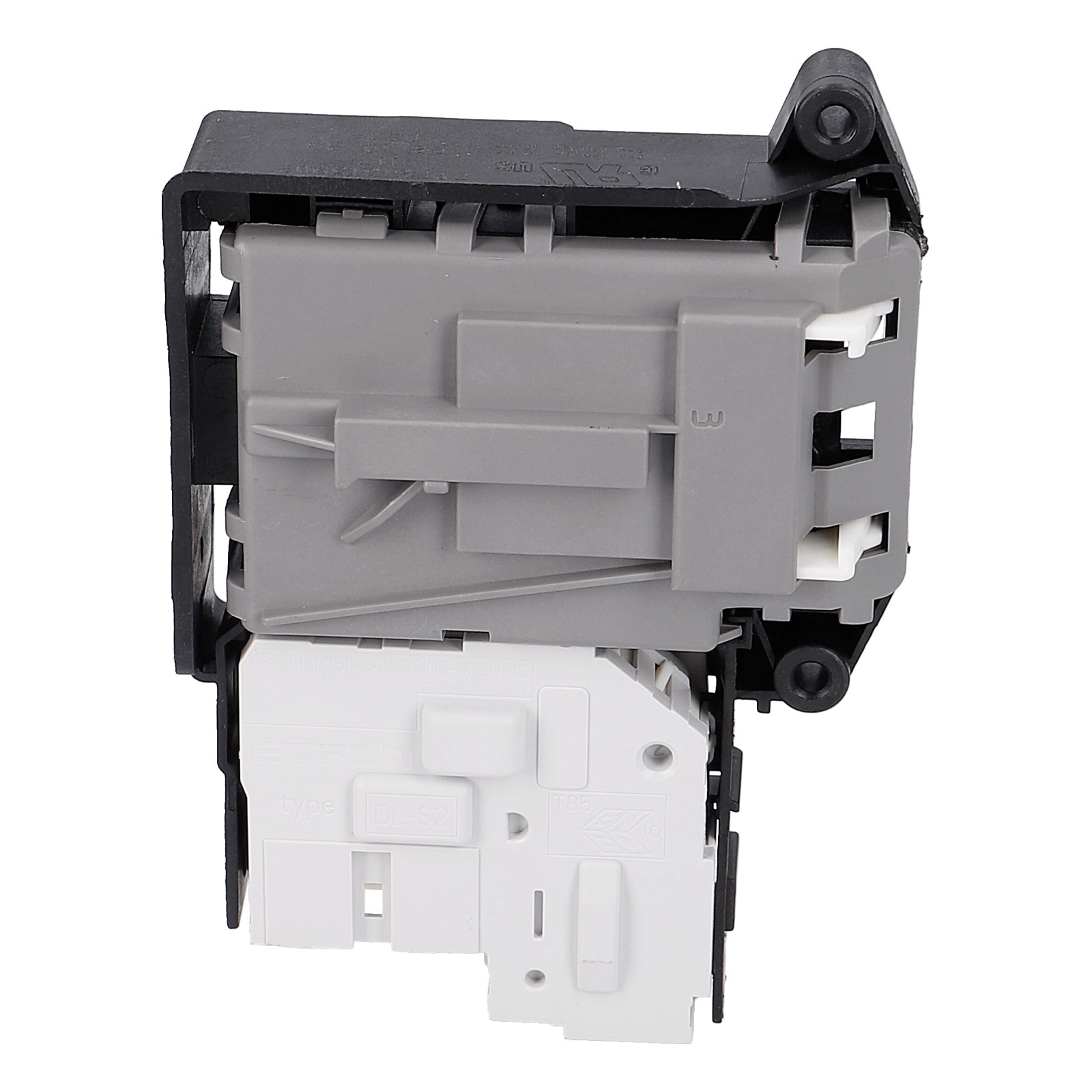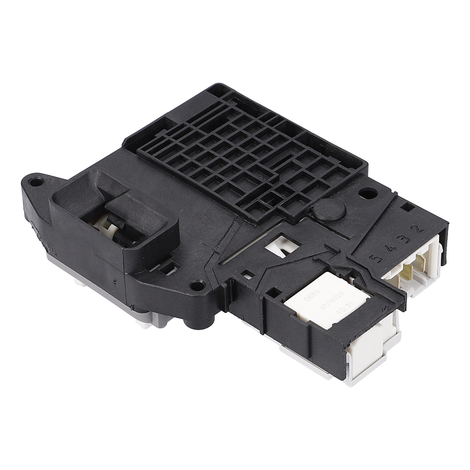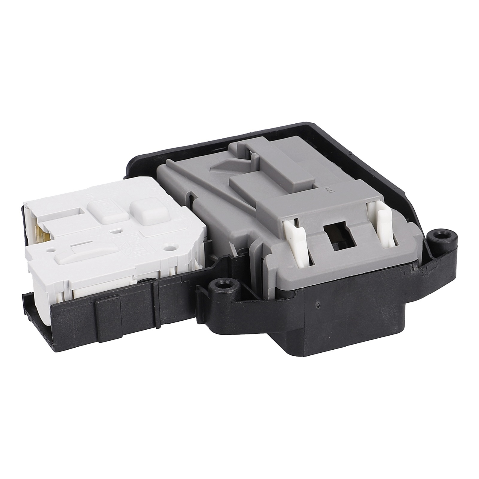 Das schwarze Verzögerungsrelais mit 4 Steckanschlüssen ist in der Einfüllöffnung vom Waschtrockner bzw. der Frontlader-Waschmaschine eingebaut. Die Verriegelung dient als Türöffnungsverzögerer.